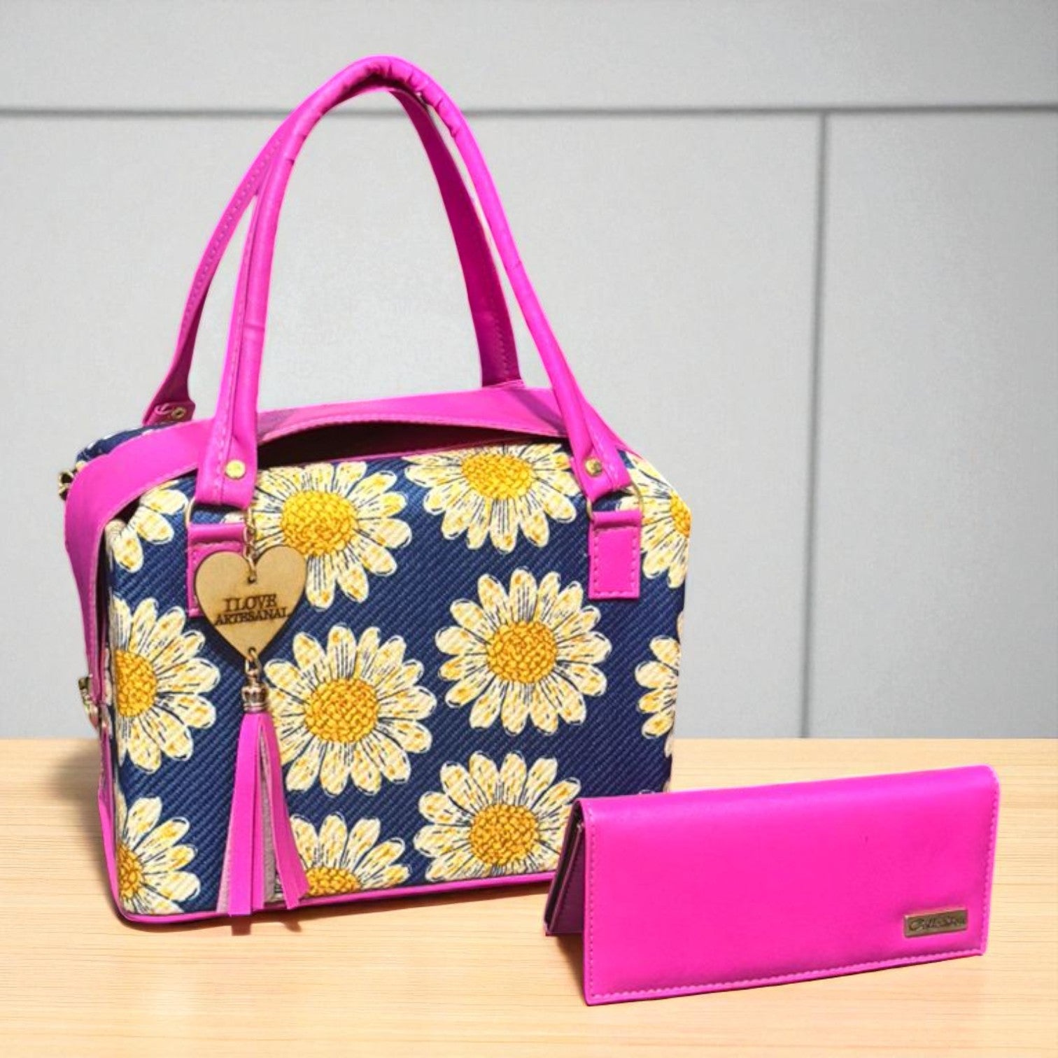 ✨🌻 Bolsa artesanal con diseño de girasoles y detalles fucsia 🌻✨