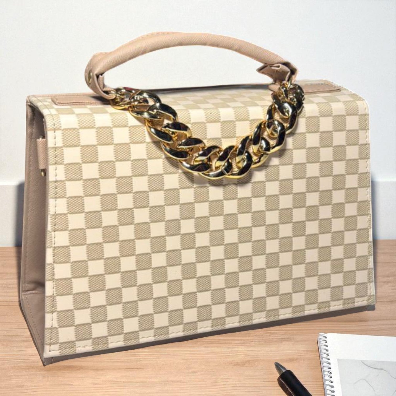 Bolsa de dama acolchada beige con cadena dorada, un diseño moderno y sofisticado que realza cualquier outfit, desde lo casual hasta lo más elegante. Fabricada en material sintético de alta calidad con acabado tipo piel, resistente y con detalles de lujo que la hacen ver como una bolsa de diseñador.