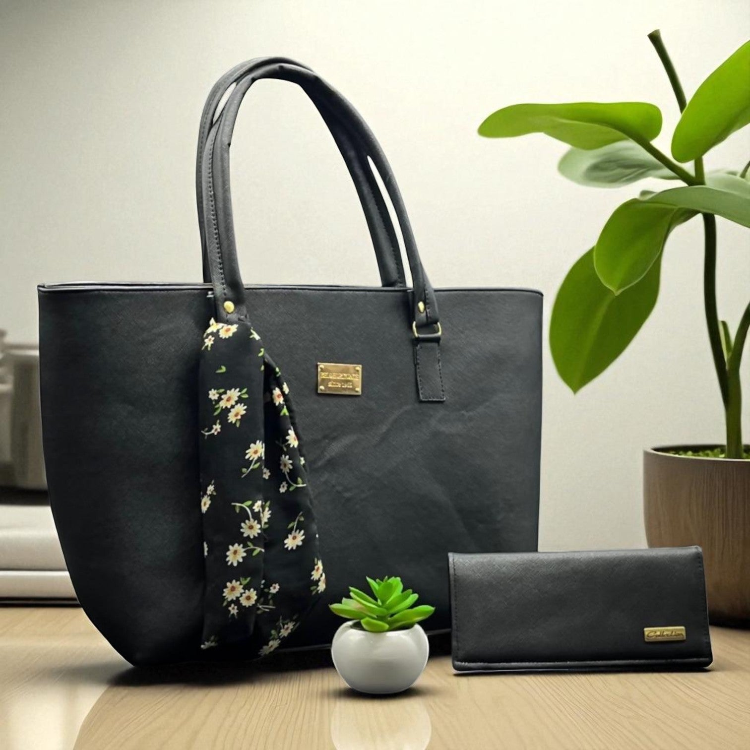 Bolsa de dama exclusiva en color negro con pañuelo floral decorativo, fabricada en material sintético de alta calidad con acabado tipo piel que combina resistencia y elegancia. Su diseño versátil y moderno la convierte en el accesorio ideal para cualquier ocasión, ya sea para ir al trabajo, la escuela o salir de compras con estilo.
